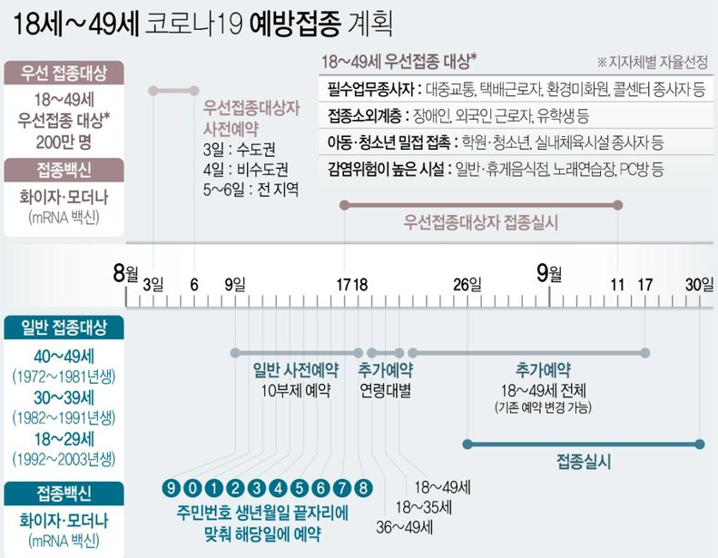 우선 1849세 가운데 택배 근로자, 환경미화원 등 각 지방자치단체가 우선 접종이 필요하다고 판단한 약 200만명은 3일 오후 8시부터 접종 일정을 예약할 수 있습니다.
