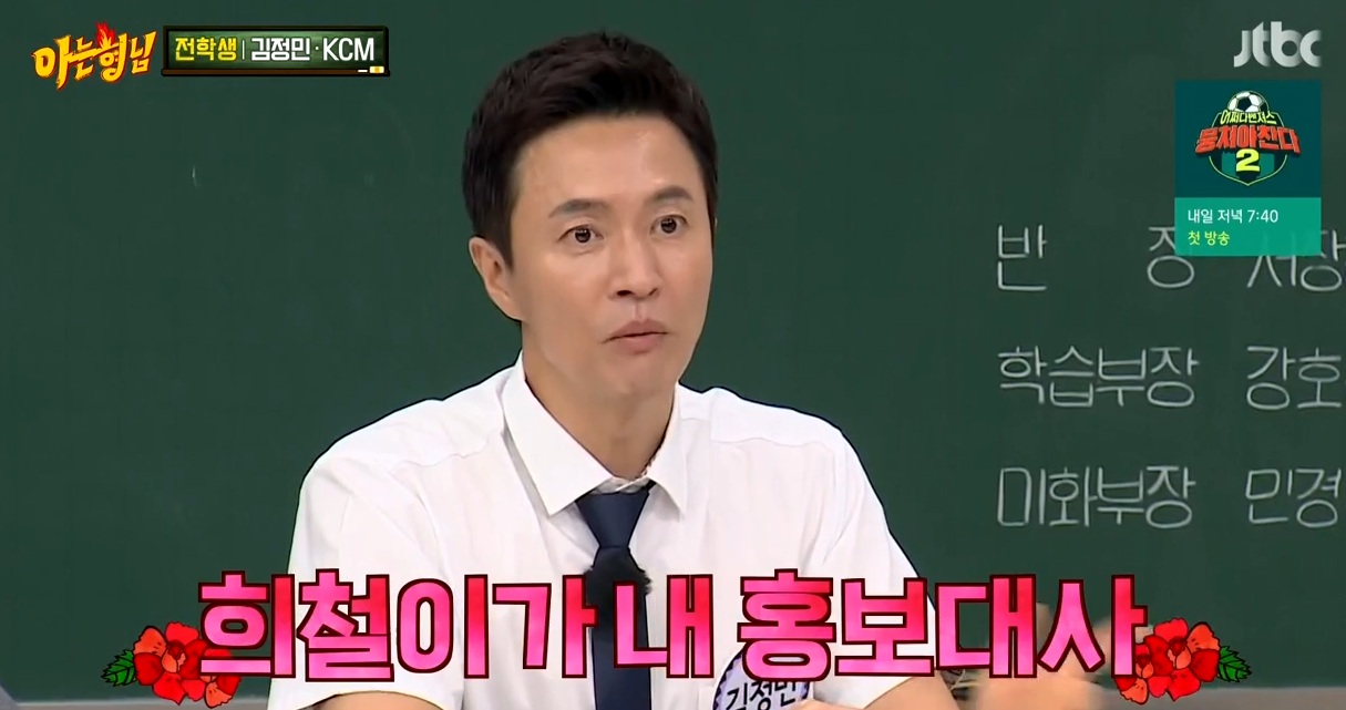 김정민은 교우관계에 '김정민 홍보대사 희철'이라고 적었습니다. 김정민은 "희철이는 꼭 자기가 회식을 하더라도 자기 모창 영상을 나한테 꼭 보내준다"고 말했습니다.