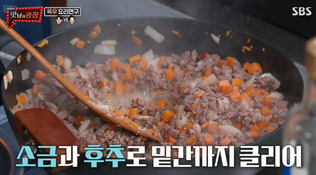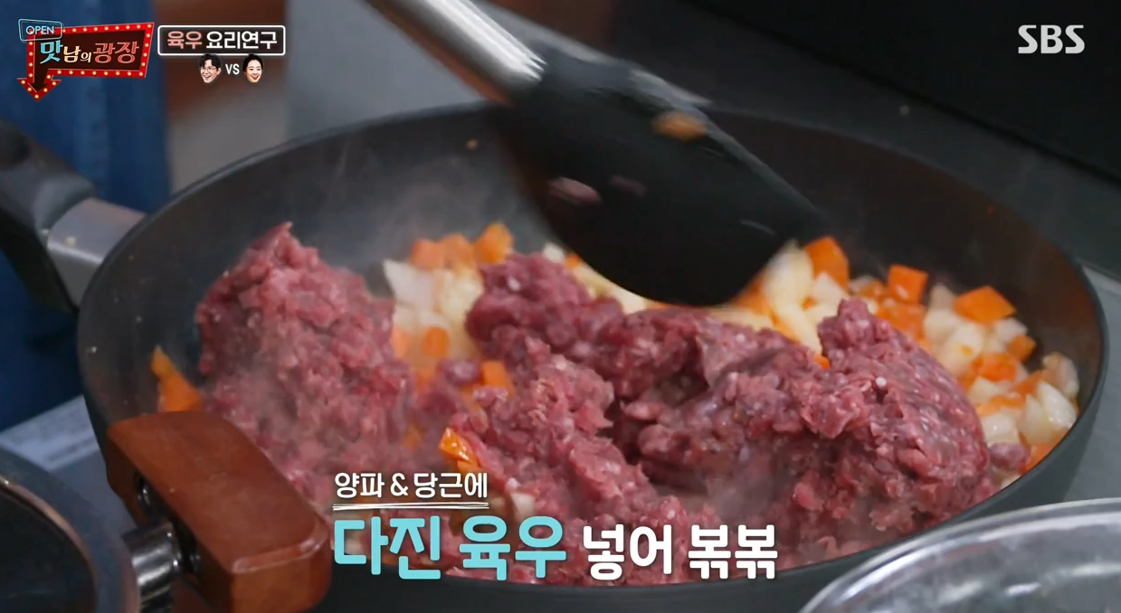 3. 후라이팬에 올리브유를 두른 뒤 썰은 당근과 양파와 다진 육우를 넣고 볶아줍니다