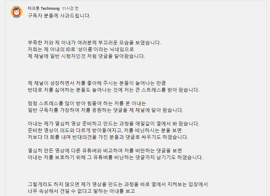 테크몽씨는 16일 자신의 유튜브 채널 커뮤니티에 "부족한 저와 제 아내가 여러분께 부끄러운 모습을 보였다"며 "저희는 제 아내의 ID '성이름'이라는 닉네임으로 제 채널에 일반 시청자인 것처럼 댓글을 달아왔다"고 털어놨는데요.