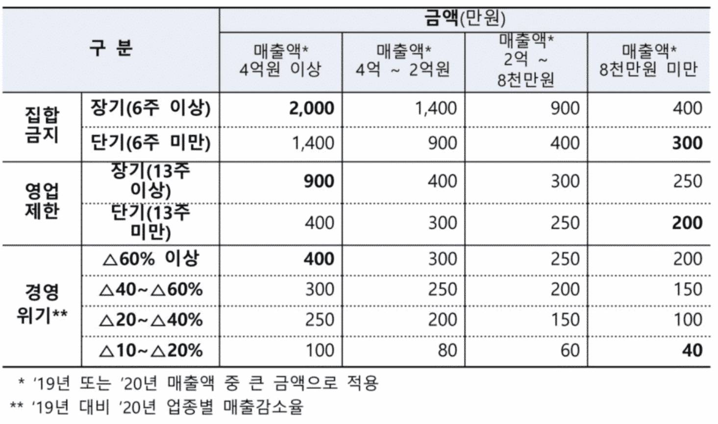 집합금지 업종은 300만~2000만원, 영업제한은 200만~900만원, 경영위기는 40만~400만원을 지원받습니다. 다수 사업체를 운영하는 경우 최대 4개 사업체에 최대 단가 2배를 지원합니다.