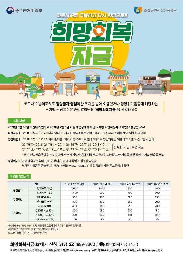 희망회복자금은 최대 지원금액을 기존 버팀목자금 플러스(4차 재난지원금)보다 두 배 이상 올리고 방역조치 기간, 매출 규모 등 피해 정도에 따라 32개 유형으로 세분화한 게 특징입니다.